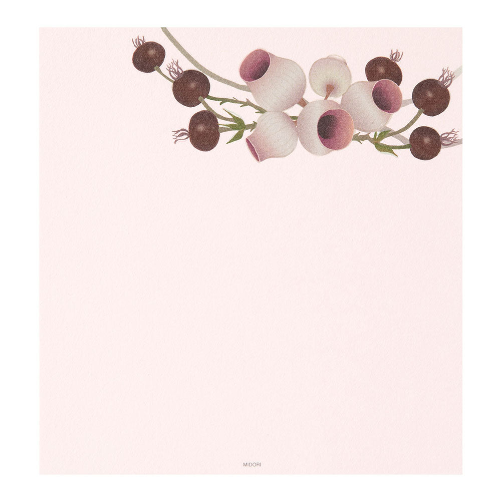 This letter paper features the rich colors of autumn, captured on traditional washi—a material with over a thousand years of history. The elegantly designed layout brings out beauty even in short messages, a hallmark of our “Kami Series.” Four types of beautifully colored berries—shell ginger, rose hip, dogwood, and eucalyptus—are arranged in wreath-like designs, assorted across the set. Printed on soft-textured Echizen washi “Echizen Torinoko” (cream color).